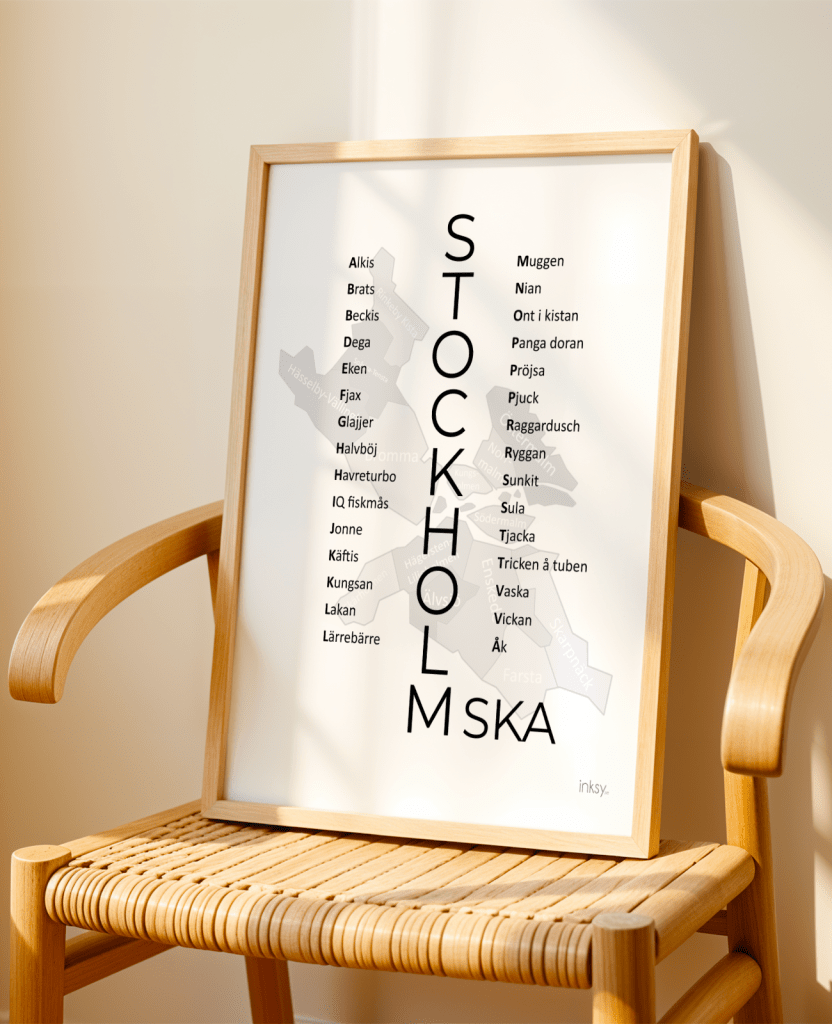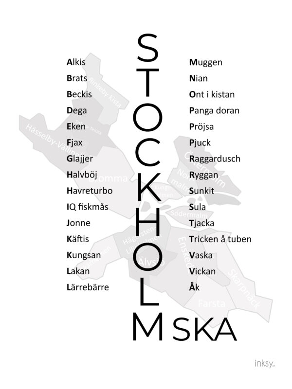 .✅ Huvudstaden Stockholm har självklart en egen dialekttavla hos oss. Här finns både äldre och lite nyare ord. Den traditionella Stockholmskan har försvunnit mer och mer med tanke på inflyttning från andra ställen. Välj mellan fem olika färger. Vilket ord är din favorit?